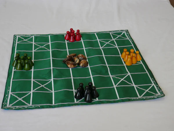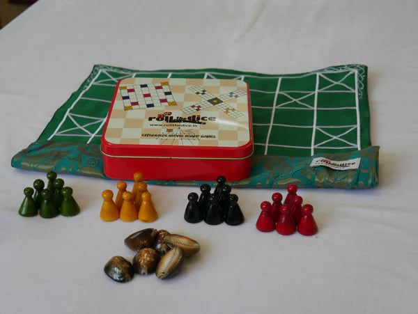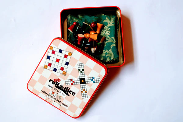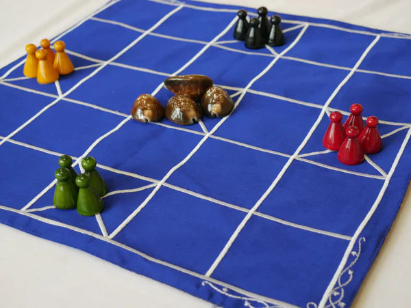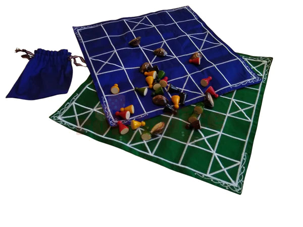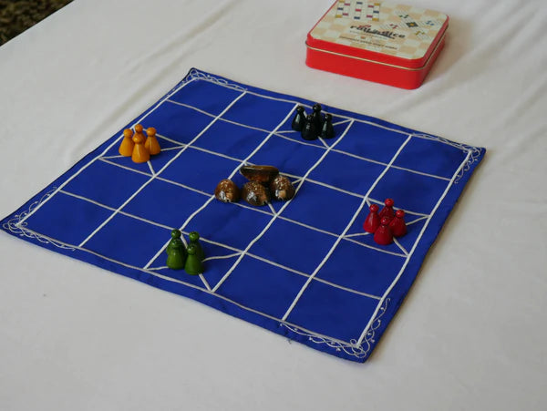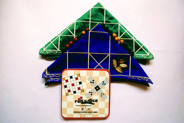 RolltheDice's 5+7 Combo set includes both 5 and 7 house boards made of high-quality silk cloth with a durable backing, as well as handcrafted pawns from the toy-making town of Channapatna. The set comes packaged in a bright red tin box for easy storage. Whether you're a seasoned player or new to Chowka Baara, this set is sure to provide hours of entertainment.