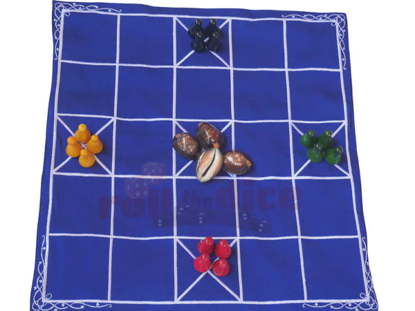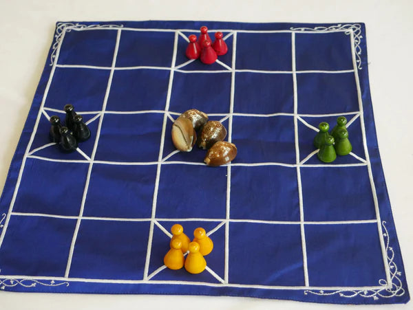 Introducing the exquisite Chowka Bara 5 House game set from Roll the Dice. Crafted from high-quality silk cloth and embroidered with silk thread, this game set is not only beautiful but also durable. The game set comes with pawns expertly made by artisans from Channapatna, known for their traditional lacquerware making skills.
