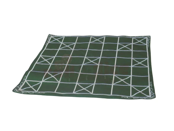 Experience the luxury of game night with Roll the Dice's Chowka Bara 7 House mat. Made from high-quality green silk cloth, this mat is not only durable but also adds a touch of elegance to your game evening. The mat is embroidered with silver thread and features 7 houses, making it perfect for group game play.