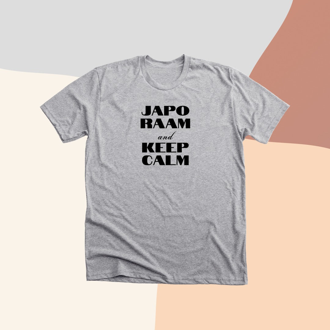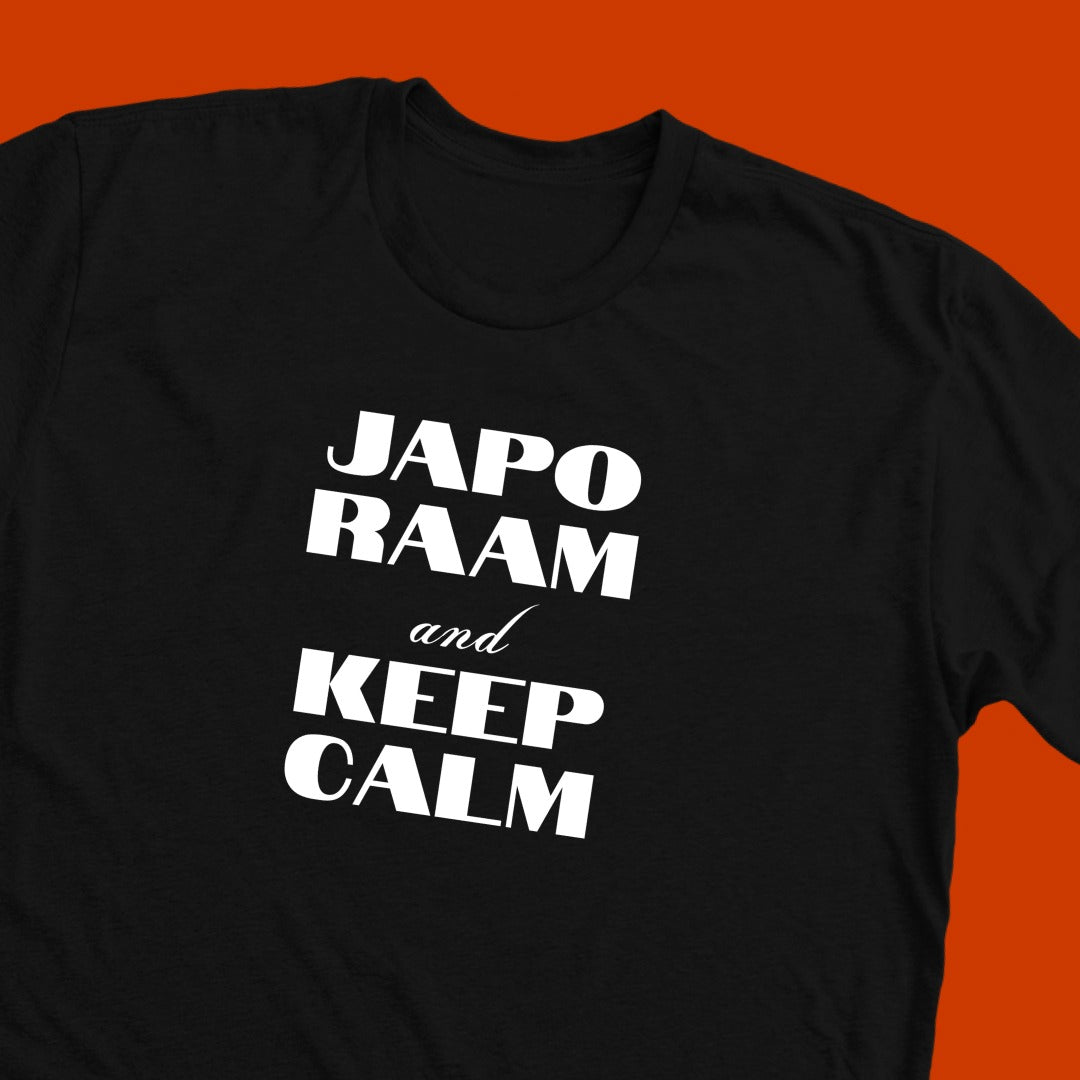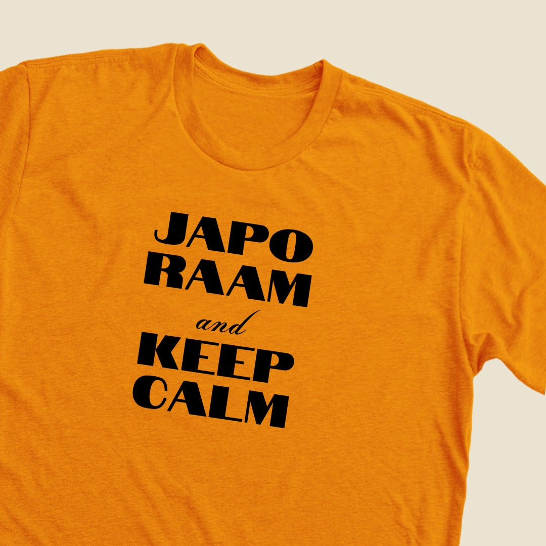 A statement piece that combines the power of spirituality with the importance of staying calm and centered in our daily lives. This beautiful t-shirt features a unique design, with the words "Japo Raam" and "Keep Calm" written in bold letters.