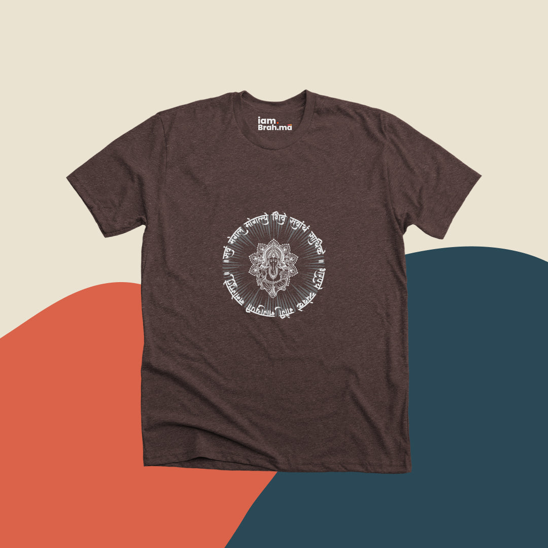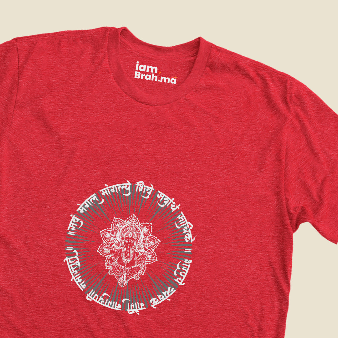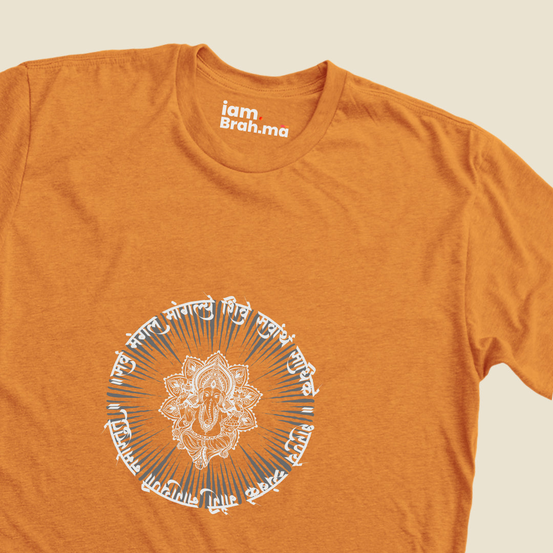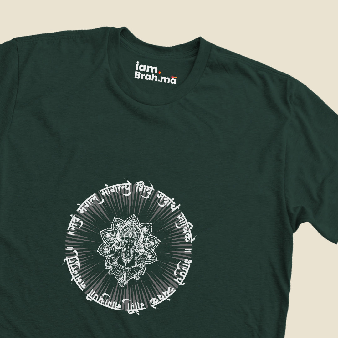 The Mangalam Tee captures this sacred energy through a divine composition — Ganesha at the center, encircled by the radiant Sanskrit verse written in flowing Devanāgarī. The circular layout symbolizes protection, wholeness, and the infinite rhythm of creation.