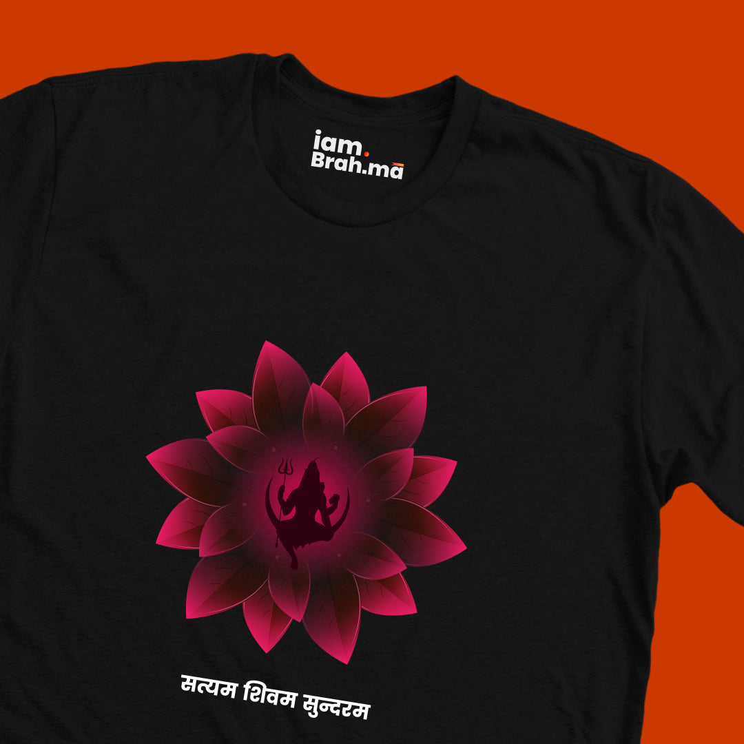 Rendered in a deep crimson bloom, the design mirrors the union of form and formless — a reminder that truth (Satyam), auspiciousness (Shivam), and beauty (Sundaram) are not separate — they coexist within you.
