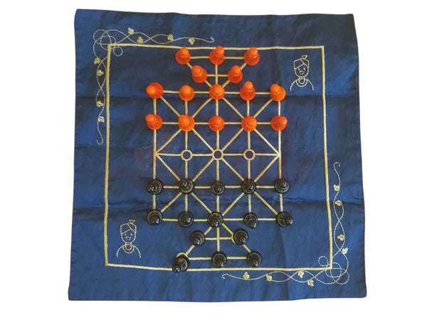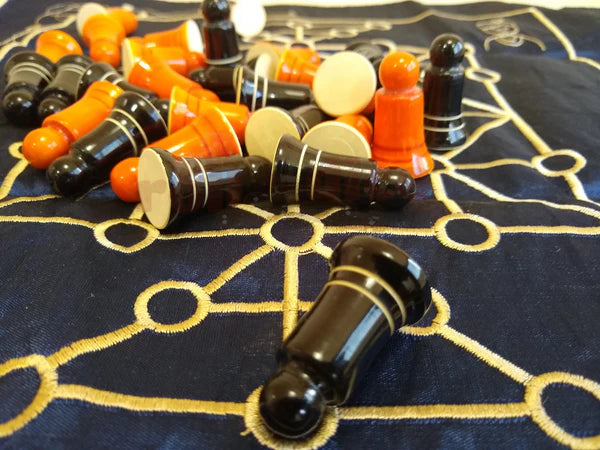Introducing Roll the Dice's Bead 16 game board set! Sholo Gutti, also known as Bead 16, is a traditional Indian game that has been enjoyed for generations. Our game board set features a beautifully crafted, high-quality board that is perfect for both casual and serious players. The set also includes all the pieces you need to play the game, including 16 orange beads and 16 black beads.